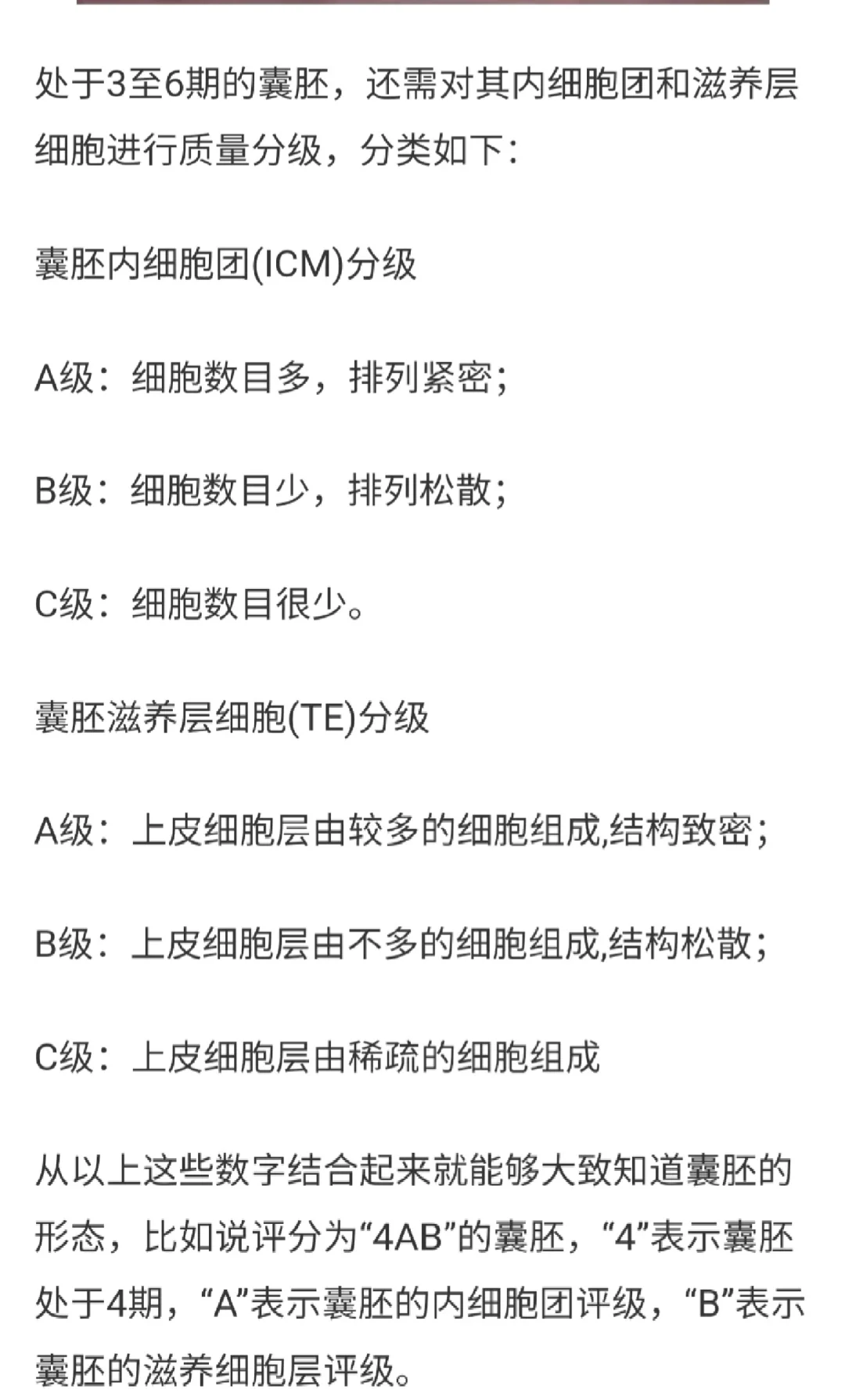 图一从浏览器下载的有关胚胎的评级。文章说,一般评分4AA、4BB、4AB、4BA的囊胚视为优质囊胚。组合来看AA>AB>BA>BB>AC>BC>CA>CB>C